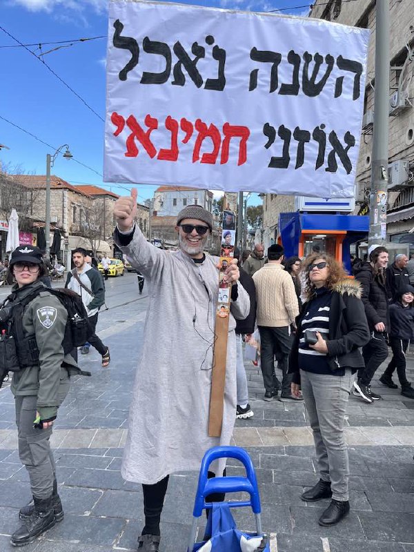 ❗❗❗Он приходит с плакатом, на одной стороне которого надпись «В этом году будем есть уши Хаменаи!», а на другой — «Мишлоах манот для Хаменаи — ред-буль».